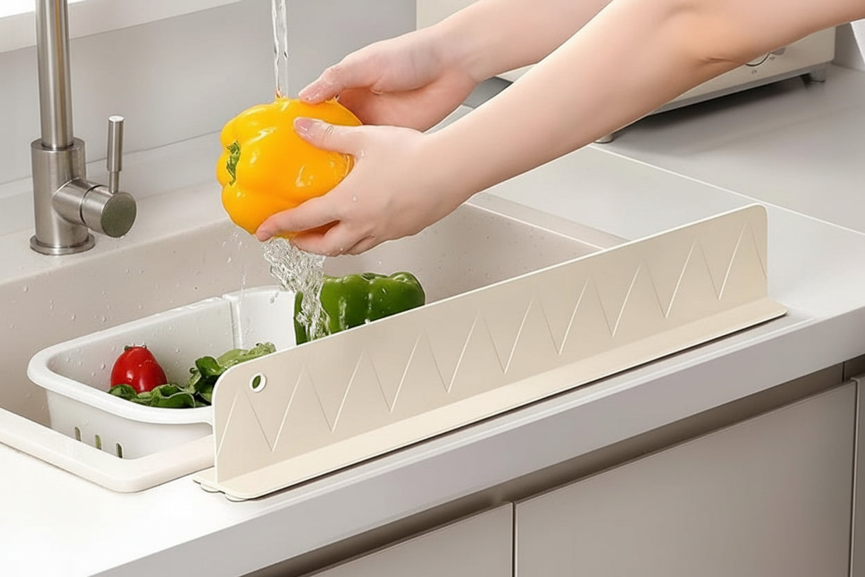 A simple silicone splash guard designed to reduce water spills around the kitchen sink. It helps keep countertops dry while washing utensils, vegetables, or hands, making everyday kitchen work less messy.