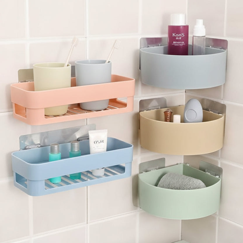 This no-drill wall-mounted corner storage rack comes as a complete set of 5 shelves and is designed to help organise everyday items in kitchens, bathrooms, offices, and living spaces. It attaches to smooth surfaces using a strong adhesive system and helps keep frequently used items within easy reach.